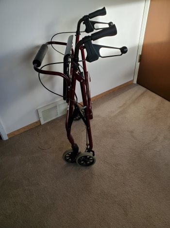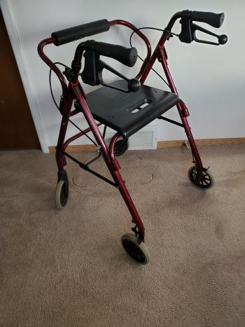4 wheel folding walker with hand brakes and park brake feature. In good condition, minor scratches. Located in Brandon. $100.00. Call, text or e-mail Brian: 204-724-0086