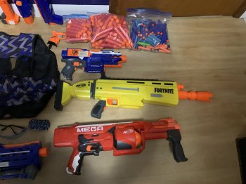 White gun in picture is not working, every other gun works great. The big blue gun has an upgraded spring, and there are two motorized guns that both come with batteries and work great. Asking $230. Text or email only please.