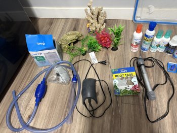 Random fish tank lot with lots of fish tank decor, all bottles have been opened so not completely full, also includes a heater and a water pump. Also including a 2 gallon tank I originally bought from petsmart, the lid has a light and it has a small filter which I have a couple filters to go with. Would like to sell everything together, a good little aquarium bundle. Selling for 70 obo please message my number or email for more information.