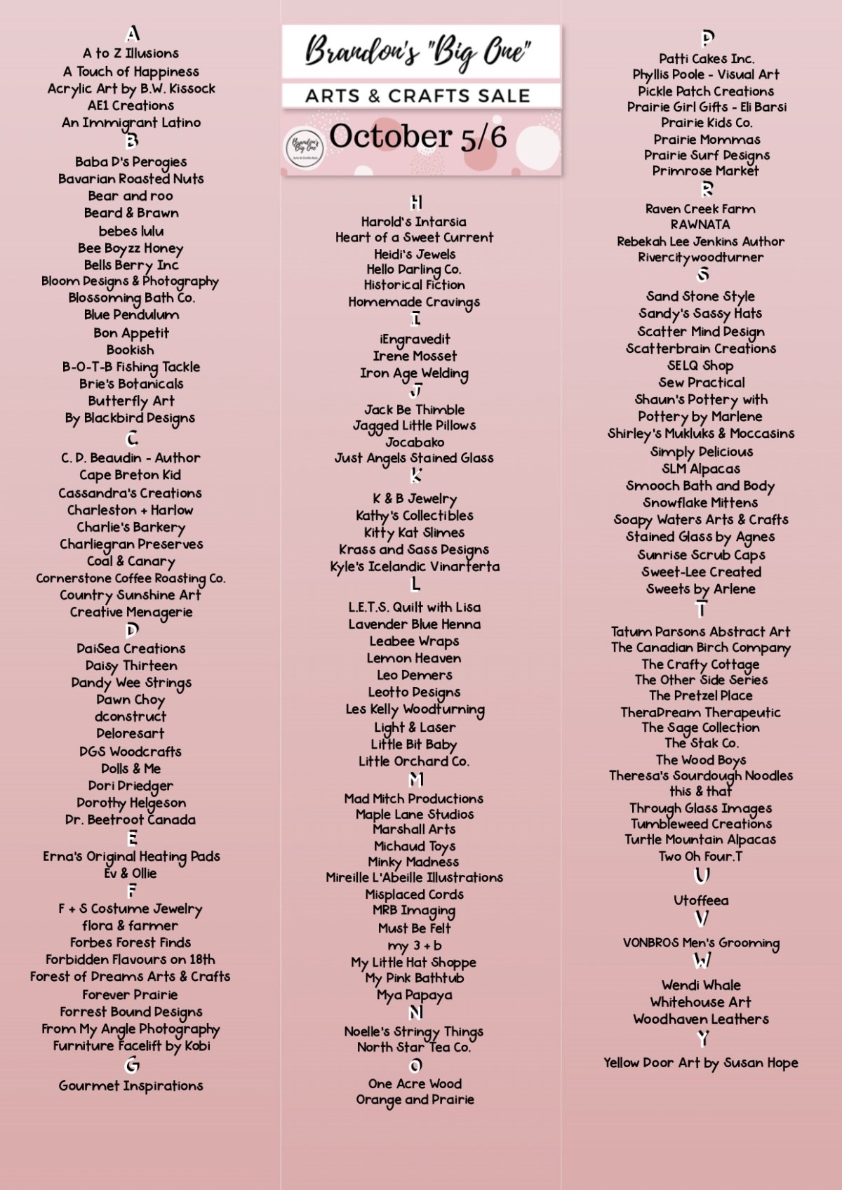 Brandon’s “Big One” Arts & Crafts Sale shared this weekend the full list of 175 vendors registered to setup for its initial October 5th and 6th show as well as the 195 to take part in a second sale weekend on October 19th and 20th.