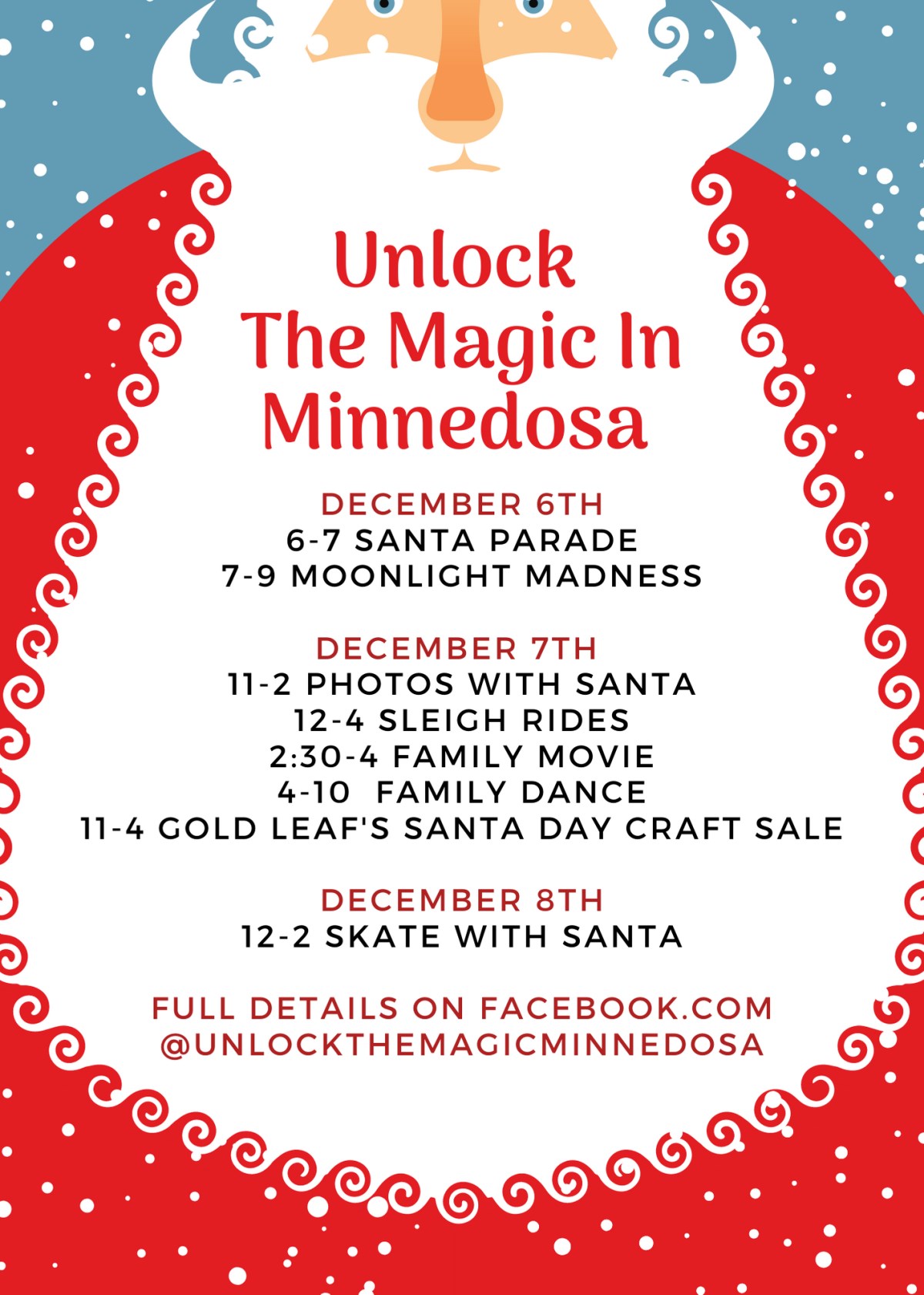 The parade will be followed by Moonlight Madness from 7-9pm, then a full afternoon of activities on Saturday (see poster) and a Skate with Santa on Sunday from 12-2.