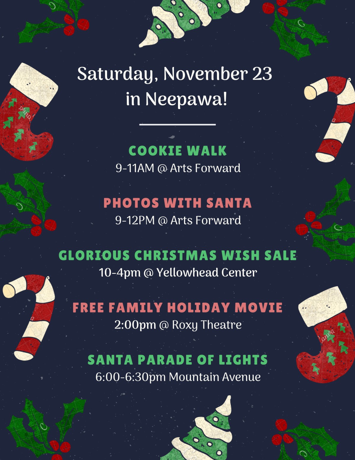 Earlier in the day at Arts Forward there will be a cookie walk (9-11am) and photos with Santa (9-12). The Glorious Christmas Wish Sale will take place at the Yellowhead Centre from 10-4 and there will be a free movie at 2pm at the Roxy Theatre.