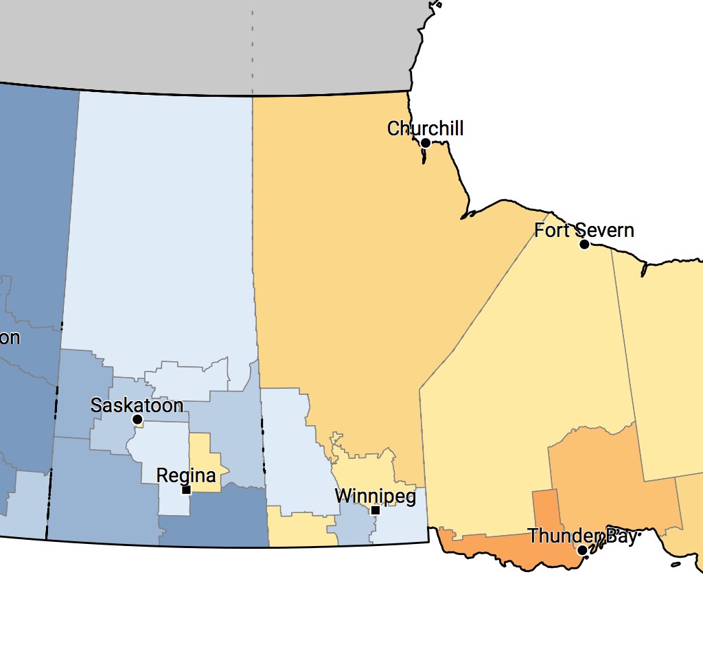 The maps make clear regional disparities in opinion, with Alberta having an estimated 42% saying that earth is warming in part or whole from human activity compared to 61% in British Columbia and 67% in Quebec. Manitoba as a province is estimated at 57% in response to the same question.