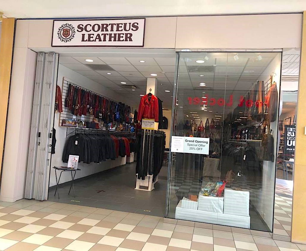 Scorteus Leather opened for business on Monday, offering an assortment of India-made 100% leather products including jackets, vests, belts, handbags, wallets and gloves.