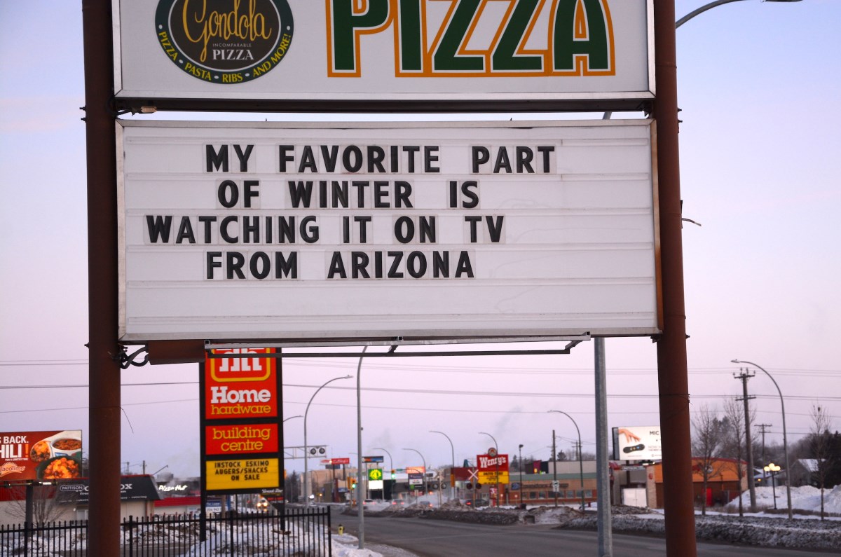 To help you get through to Monday’s something-of-a-warmup to more seasonal temps it appears at least a couple of our local restaurants might be engaged in a bit of a game of sign one-upmanship. The messaging on the sign in the picture attached to this post is currently up at Gondola Pizza/Keystone Motor Inn on 18th street... not long after you may have read about the little bit of fun The Dock had with their own sign this week at the expense at Mother Nature.