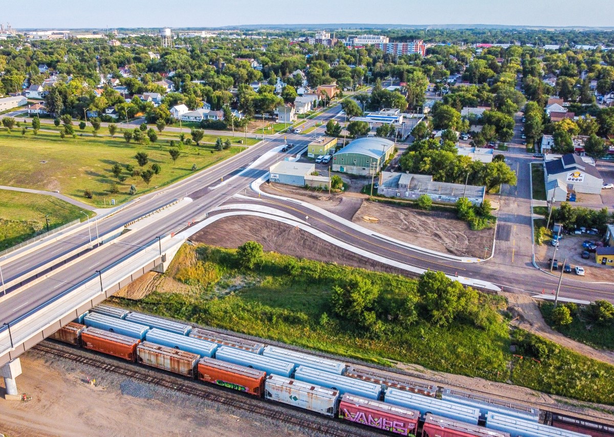 The Manitoba Infrastructure project saw Pacific Avenue re-oriented at 2nd Street to curve towards and intersect with 1st just South of the bridge spans.