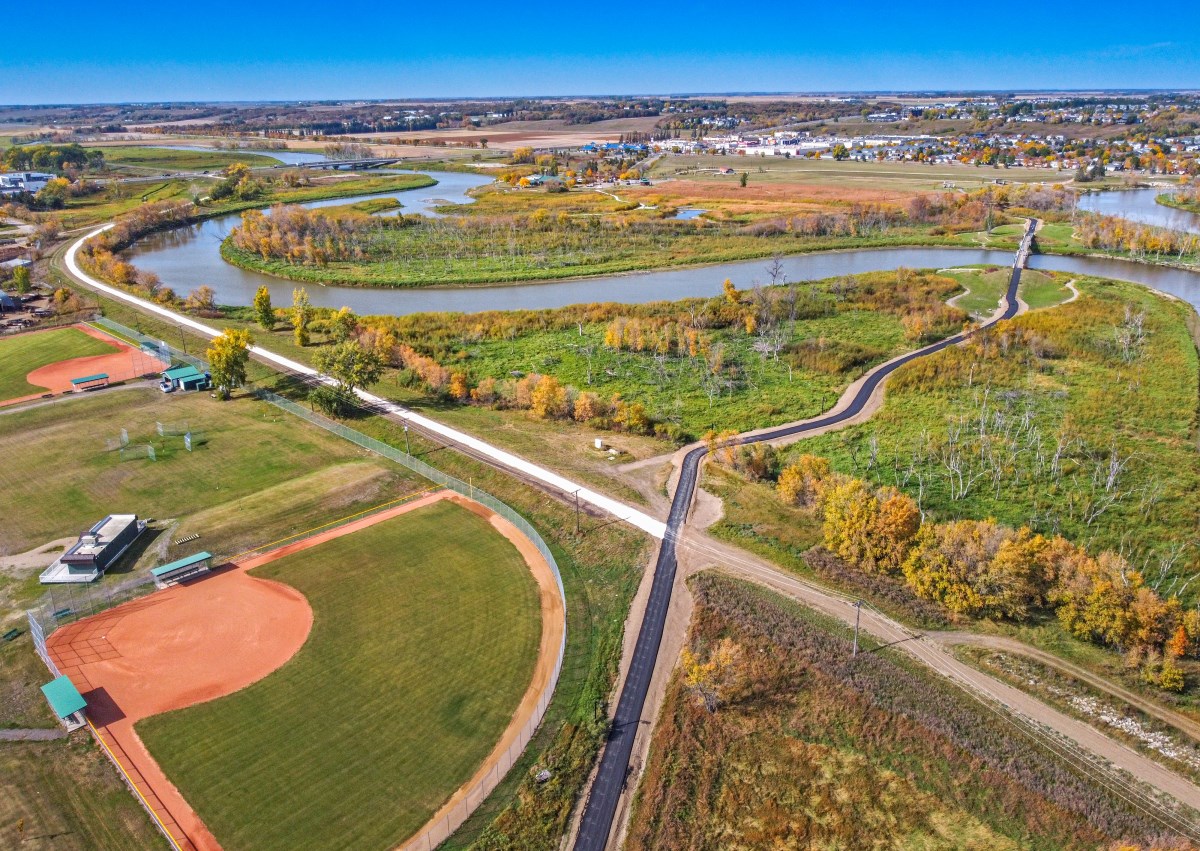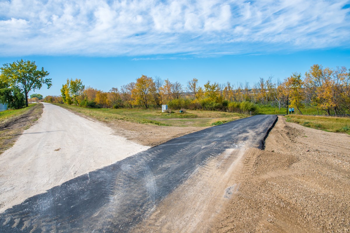 This month has seen the re-paving, and in some places re-grading, of a long stretch of path that runs North-South up to and past the popular Red Willow Pedestrian Viewing Bridge. Path continues up to and intersecting with the city’s dike system which is now surfaced with crushed limestone more suitable for pedestrian use. Newly paved path also extends over and past the dike system around around Parker Boulevard to the Ashley Neufeld Softball Complex.