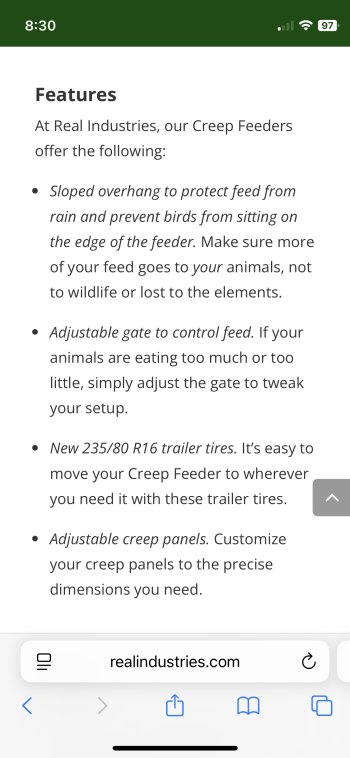 130 bushel Real Industries creep feeder for sale. This feeder is essentially brand new. Only used it for 3 days. It seems like a very sturdy well built feeder. See last two pictures for details off Real Industries website. Ordered it last fall to feed oats to my replacement heifers but they spent too much time at it and were eating more oats than I wanted them to so I’m switching to pail feeding. New price was $5,460 when I ordered it back in October. Asking $5,200 for it now. Located at Lakeland MB. Call or text Terry at 204-872-2815. Thanks!