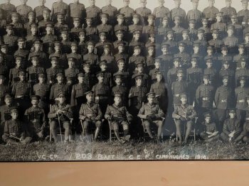 Rare original WWI era Black & White Group Photograph of C Company 203rd Battalion CEF (WinnipegRifles) Canadian Expeditionary Force at Camp Hughes in 1916. This unit was recruited from Manitoba in 1915/16, and deployed to England in October 1916, where they were incorporated into the 18th Reserve Battalion in January of 1917. Probably taken just before they shipped overseas from Camp Hughes.