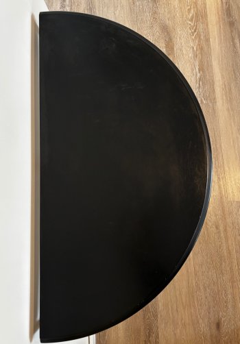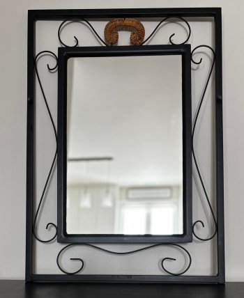 Black metal with wicker accents, this table and mirror are in good condition. Table measures 31.5x16 inches and mirror is 22x31 inches. Smoke-free, pet-free home. Accessories not included.