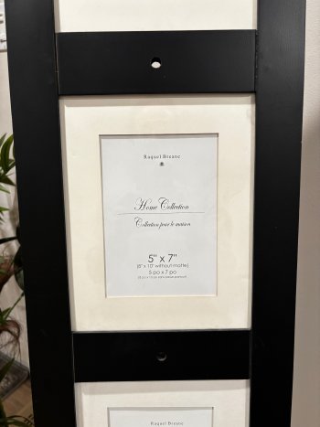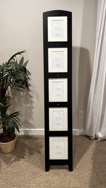 Black wooden standing photo frame holds five 5x7 photos. New condition. 64 inches high, 11.25 inches wide.