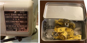 Domestic sewing machine (antique) with fold-away table top and stool.
