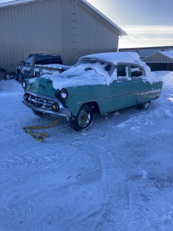 1953 Chevy bel air 4 door.. project roller.. last registered in 1963 but I have a current TOD in my name.. body in excellent shape but there is some rust in truck area..factory green tinted glass/ factory fender skirts..all glass/ chrome and stainless in excellent shape.. on an S10 frame with front disc brakes.. set up for small block chevy( of course) Has square body tilt column with key, front grey Envoy power seats with the built in seat belts. Was originally ivory but someone painted it robins egg blue with a paint brush.. can see the brush strokes.. cool detail and patina.. located just outside of Brandon.. call or text Peter @ 2047256333.