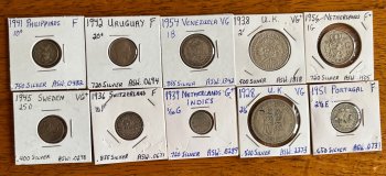 10 International silver coins with a combined Actual Silver Weight of 1.0103 ounces of silver. The coins are well circulated and of value mainly for the silver content. My price reflects the melt value only as of February 12, 2025. The coins on offer and their Actual Silver Weight are as follows: 1928 UK half crown (.2273), 1938 UK 2 shillings (.1818), 1941 Philippines 10 centavos (.0482), 1936 Switzerland half franc (.0671), 1942 Uruguay 20 centavos (.0694), 1939 Netherlands Indies 1/10 gulden (.0289), 1954 Venezuela bolivar (.1342), 1951 Portugal 2 1/2 escudos (.0731), 1956 Netherlands gulden (.1505) and 1945 Sweden 25 ore (.0298).
