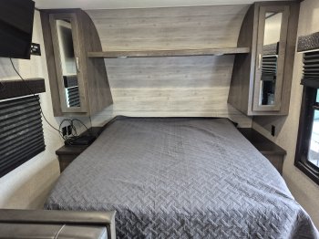 -queen sized master bed that you can get in and out on both sides of bed and privacy curtain. Under bed is large storage area