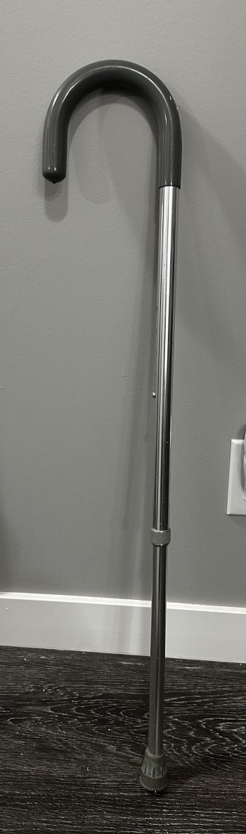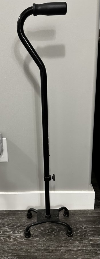 Last one is a black quad cane, soft grip handle, super stable with its four-point base.