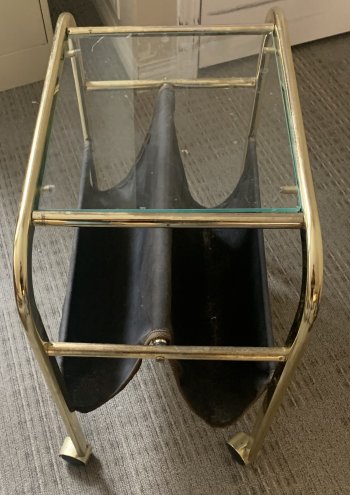Stylish brass-tone metal rolling magazine/newspaper rack.