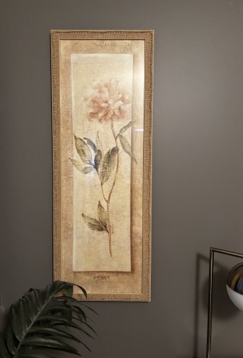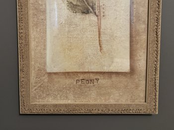 Beautiful matching framed floral prints in warm neutral tones. One features a peony and the other an orchid. Natural textured frames with a classic look. Works well in any room. Excellent, like new condition.
