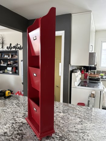 37 inches high/ 4 3/4 wide colour red. Some scratches. Can be hung on a wall or sit on the floor. A fun piece of furniture.