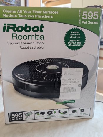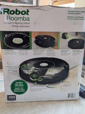 iRobot Roomba Black 595 Pet Series Robotic Vacuum with Accessories and Manual. The unit is in good working. It comes with the original documentation, NEW brushes, NEW filter, the dock, door/stair sensors, and the original power adapter. NEW battery.