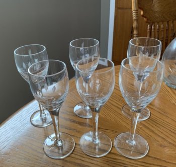 Beautiful Czech wine Decanter with 6 wine glasses, never used. Etched with beautiful flowers/ leaves. Excellent condition