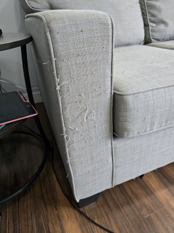 Pretty good condition couch and love seat. Lots of life left just had a cat that scratched it as shown in pictures. Covers come off for easy washing