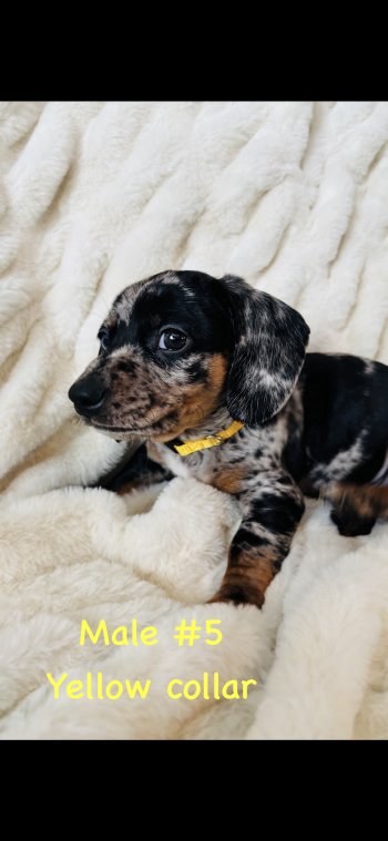 We had 7 adorable pure-bred miniature dapple dachshund puppies, 3 boys are left and looking for their forever homes. these puppies have been raised in our living room with our family and had lots of cuddles and playtime. Mom is a short haired dapple, dad is a black & tan.