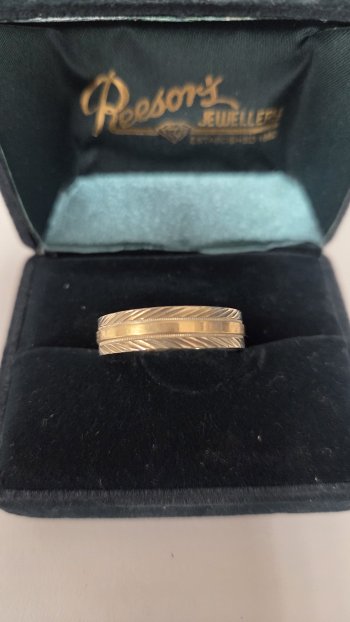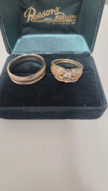Complete bridal set. Engagement ring & ladies wedding ring (size 8) and mens wedding band size 10.5. Purchased at Reesors jewelry. Beautiful set.