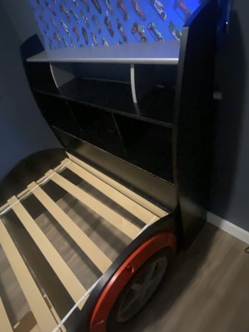Well loved twin size car bed without mattress. comes with a matching dresser one of the drawers has been fixed .