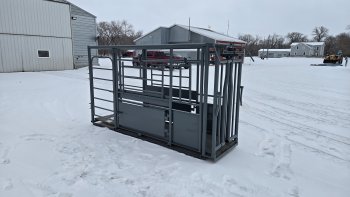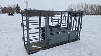 Adjustable headgate with palpation cage.