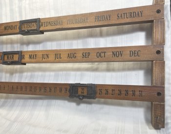 Wooden vintage rustic craftsman calendar that will stand on the back of your desk or can be hung on the wall. The calendar measures 19 inches wide and 10 inches tall and has a rail for the month, day of the week and day of the month. Very unique decor piece that is sure to be a conversation starter. 20