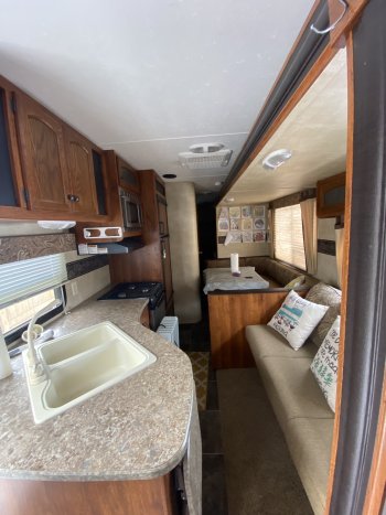 Slideouts: One mega slideout with a hide-a-bed sofa and U-dinette