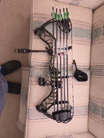 Bear compound bow loaded ready to use has everything you need to get started 5 pin lighted sights. Comes with wrist release newer autograph strings, arrows , stabilizer, whisker biscuit, quiver. Can include target and hard case for 600 or trade for ice fishing fish finder. Txt or call