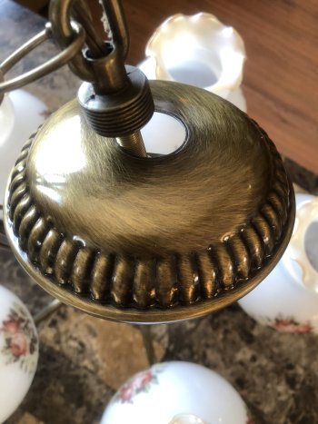 -Beautiful Vintage 5 Shaded Brass & Solid Wood Chandelier