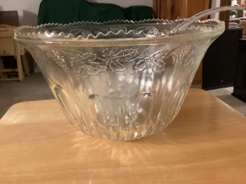 Punch bowl comes with a ladle, 8 cups and 8 hooks. Excellent condition no chips or cracks.