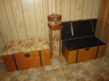 set of 2 wooden storage trunks with tapestry padded seating - new condition - matching disp[ay pedestal and small item box included with set
