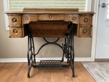 Beautiful antique sewing machine with treadle. Wooden cabinet has a small amount of damage to the finish (shown in picture), but is otherwise in great condition. Sewing machine hasn?t been used in years, but with some oil & a good cleaning it should work well. Whether you use it for sewing or not, it makes a gorgeous accent piece!