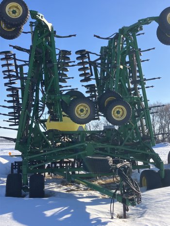 2008 John Deere Air Drill with 430 bu 1910 tank. 10" spacing, 3 " dutch openers, 3" rubber capped packers, updated ecu with wire harness, spare tire, 8" load auger, 20.8 r-42 duals, all 3 metre housings were disassembled, sand blasted, epoxy coated and painted 5 years ago. Next to no rust on bottom of tank.