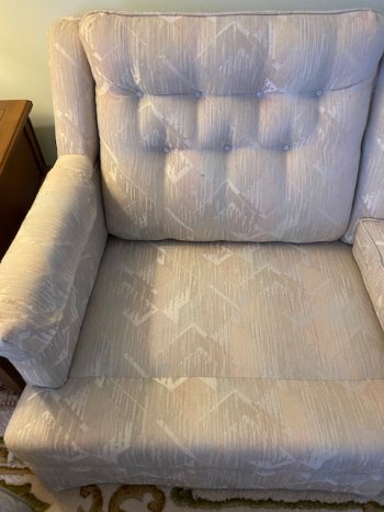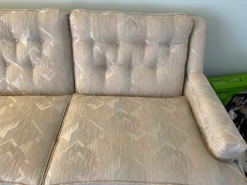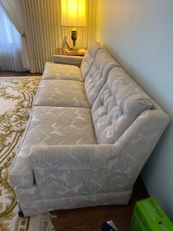 An older but in pristine shape couch...measures 7.5 ft long...very clean and maintained...no tears or stains....see close up pics.