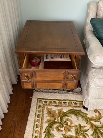 All wood end table in great shape with rectangular top...21" h x 25" d x 21" w....$100 OBO......please call phone # listed and leave message if necessary....or email me with your phone # and we will call you ...posting for my Uncle