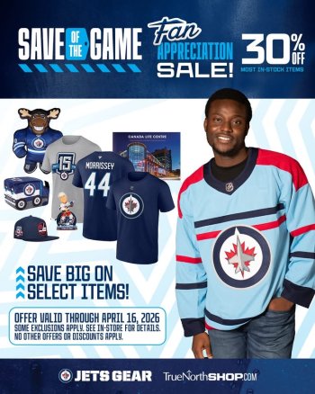 That night is Fan Appreciation Night. ALL FANS IN ATTENDANCE WILL RECEIVE A MYSTERY PRIZE & A FREE FOUNTAIN DRINK! In addition, there will be all kinds of GIVEAWAYS throughout the game, plus 30% OFF most in-stock merch at Jets Gear!