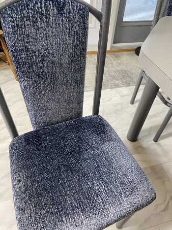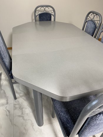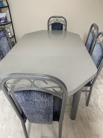 Excellent condition. Grey table, 5 blue chairs and 2 leaves.