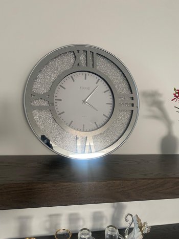 Elegant wall clock has a mirrored finish with a sparkling glitter inlay. Round 20 inch frame features large Roman numeral cutouts. White center dial is branded PINNER England with silver-tone hands. Back has a standard battery-operated quartz movement and integrated hanging hook.