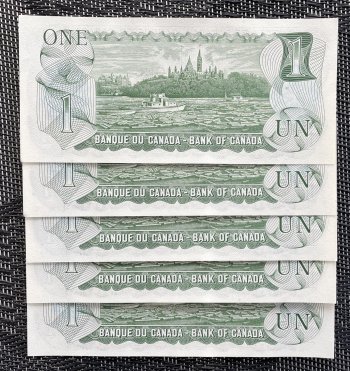 This set of 5 uncirculated $1 bills from Canada in 1973, features the Crow/Bouey signature combination. The bills are consecutively numbered, perfect for collectors of Canadian banknotes.