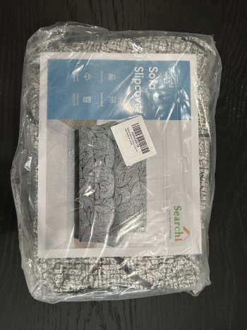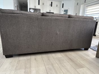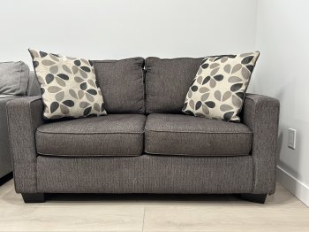 Charcoal gray living room set includes a full-size three-cushion sofa and a matching two-cushion loveseat. Both pieces are upholstered in a durable textured woven fabric and come with four decorative leaf-patterned throw pillows. Set also includes FOUR brand new Searchi brand stretch sofa slipcover in a white and black patterned print, still in its original packaging.