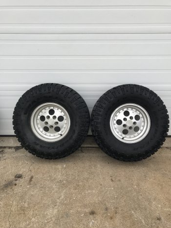 4 Wheels, tires, and winch bumper for sale. They came off a 2000 Jeep TJ. Aluminum wheels. Tires are Goodyear Wrangler Duratrac M&S 33x12.50R15LT. Lots of tread left on them. $1,000. for the wheels and tires. $200. for the bumper. Call Don 2398032.