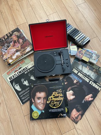 Lot # 4: Musical collection includes record player that works, 29 vinyl records various music anything from The Rolling Stones, to Elvis to The Beatles, plus cassettes. $125.00