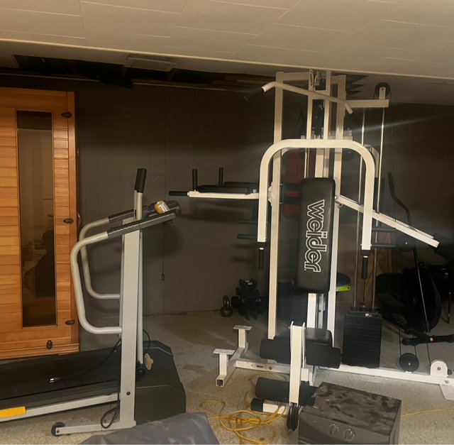 Images: large home gym, heavy bag, elliptical, rowing machine and sauna