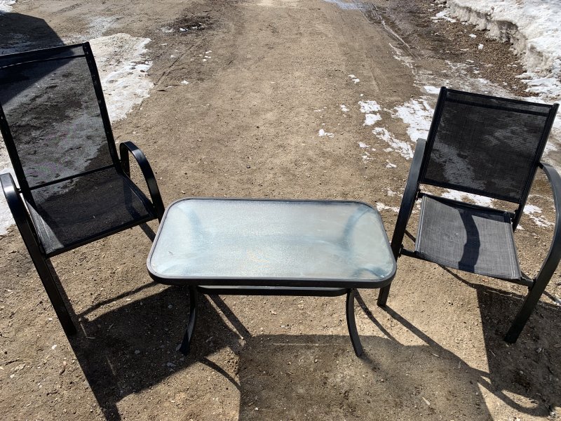 >> Back to listing page for 'Patio dining set two mesh-backed chairs and a glass-top tabl'
