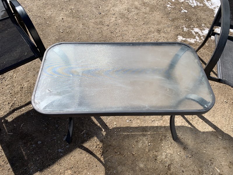 >> Back to listing page for 'Patio dining set two mesh-backed chairs and a glass-top tabl'